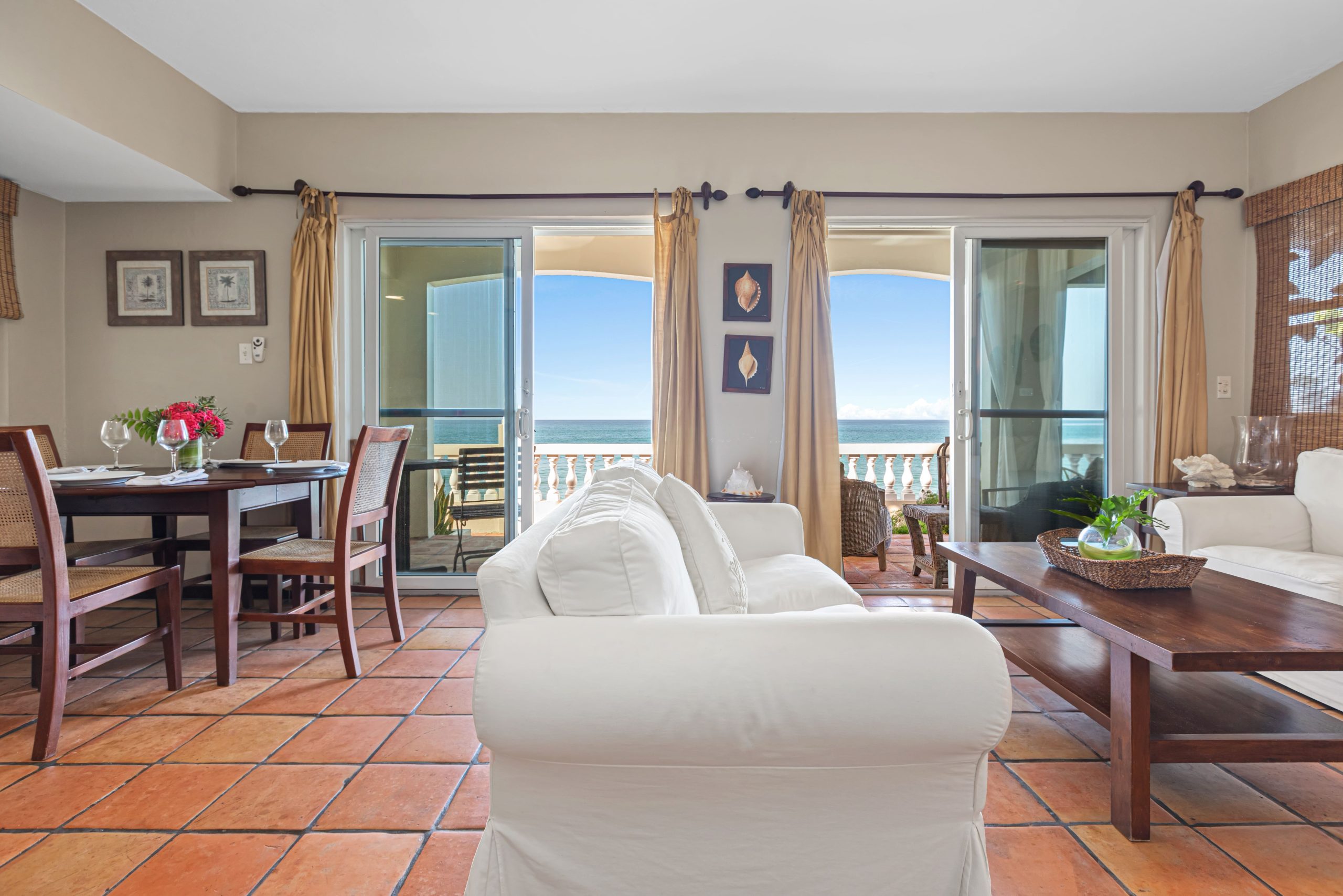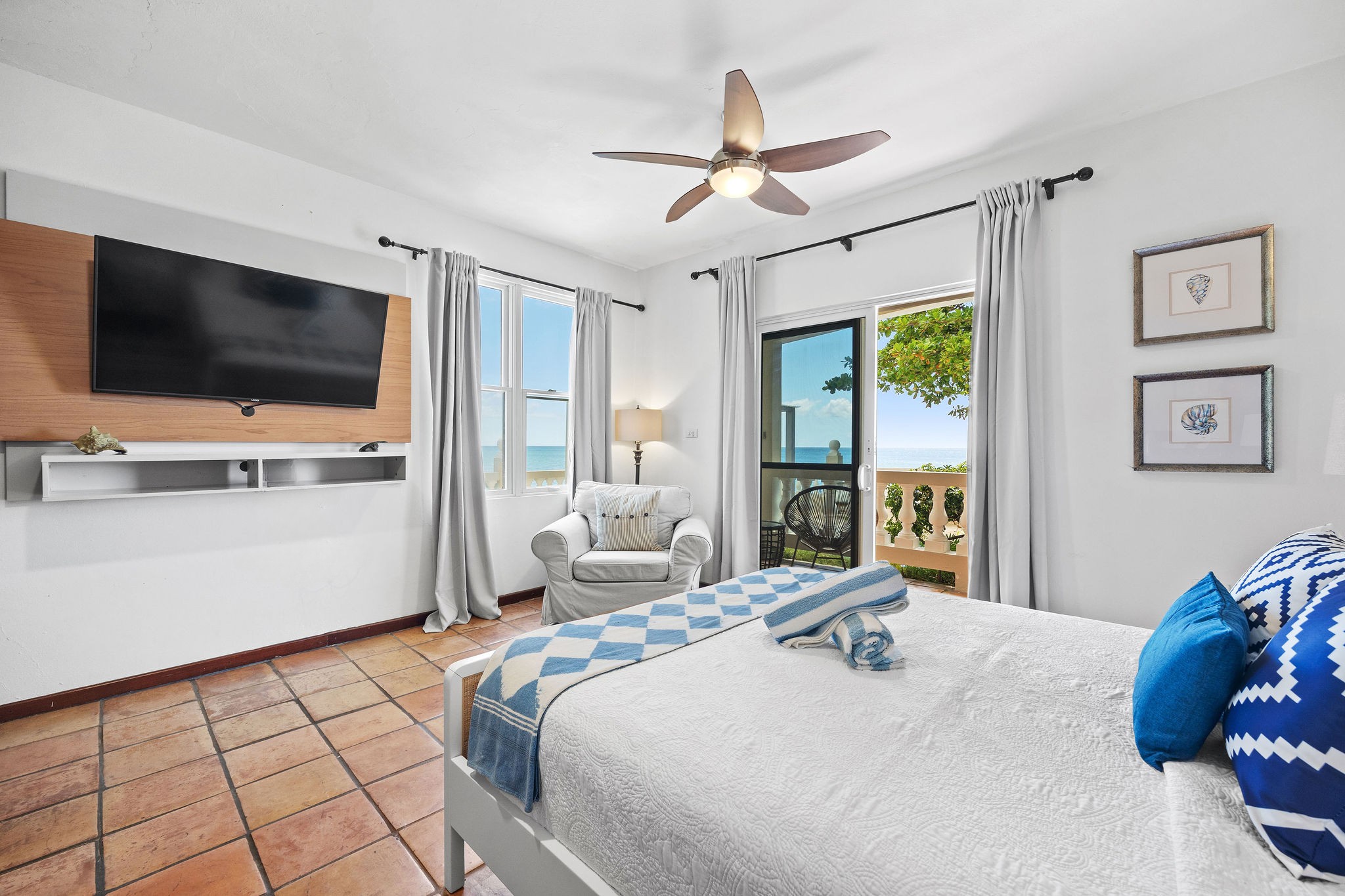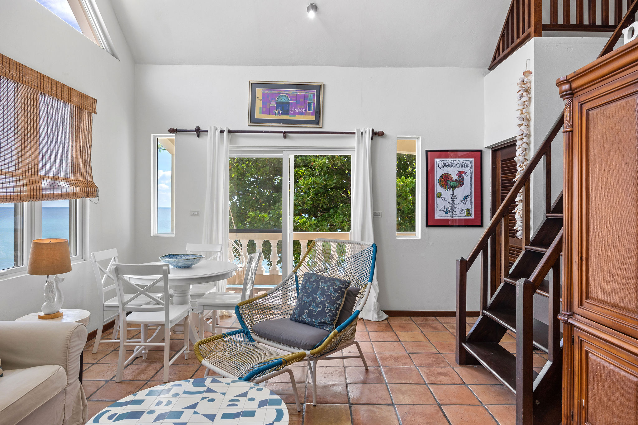 A stunning second-floor penthouse apartment offering 280° panoramic views of the ocean. Featuring an open floor plan with vaulted ceilings, the living area includes a fully equipped kitchen, dining area, and wrap-around 40-foot beachfront balcony. The master bedroom has a kingsize bed and private balcony access. A loft upstairs includes two twin-size sofas and a small workspace. (Note: not suitable for small children, elderly guests, or multiple adult couples due to stairs and layout.)